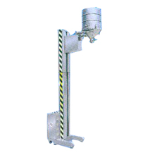 該機主要由底盤、立柱、提升系統(tǒng)和翻轉(zhuǎn)系統(tǒng)等組成。工作時先將物料放入料桶,再啟動提升按鈕,將料倉提升到所需高度,然后啟動翻轉(zhuǎn)按鈕,料倉即可翻轉(zhuǎn)180度,旋轉(zhuǎn)立柱與加料設備密閉對接,進行加料操作。